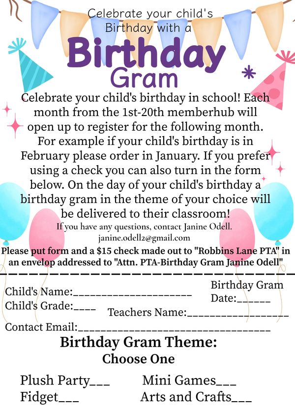 Due to the new allergy procedures to make birthday celebrations safe and fair for all children at Robbins Lane the birthday bins got a makeover. The new birthday gram will no longer provide a shared snack for the classroom but now will be an upgraded surprise for just the birthday child to help make them feel special. You will have a choice between 4 themes to help cater to each child’s interests. We look forward to being able to continue birthday celebrations in this new way!