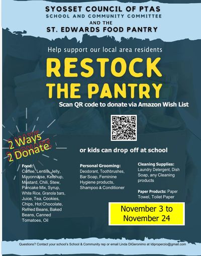 The School and Community committee is running a drive to benefit the St. Edward Food Pantry from November 3-24. Each school lobby will have a box/bin for donations, and there's also an Amazon wish list, allowing people to send items directly to the food pantry. The food pantry is in desperate need of food and other items.